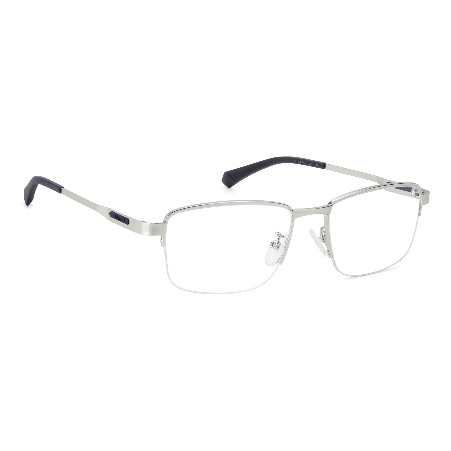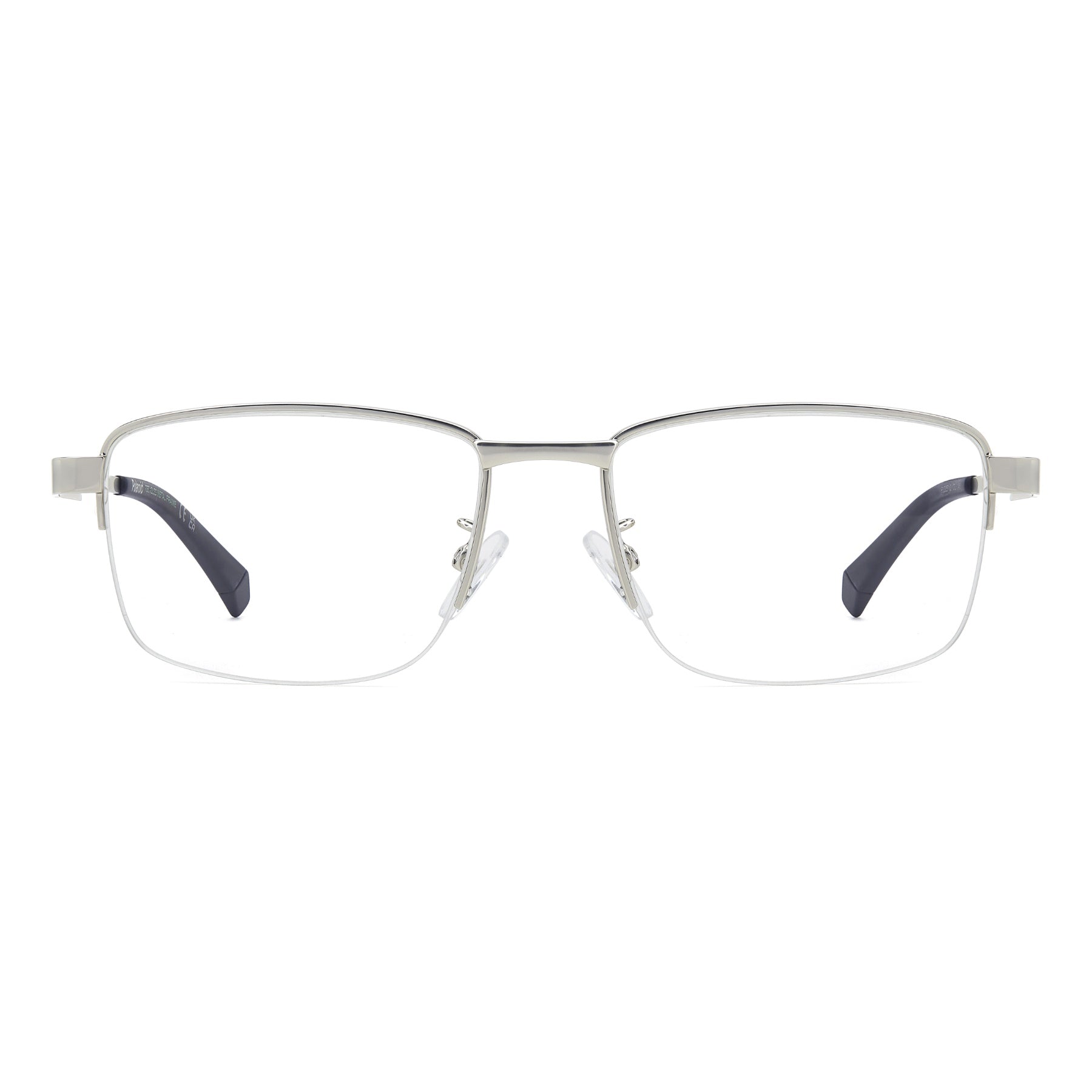 Meticulous design defines these Polaroid eyeglasses with a half-rim front and suspended lenses. They're a sustainable choice because they're made of recycled stainless steel, which is highlighted by the inscription on the inside. The minimalist temples are defined by the rubber logo insert, an expression of a sporty aesthetic. Adjustable nose pads and the Global Fit design ensure absolute comfort for every face shape, while perfectly balancing style and functionality.