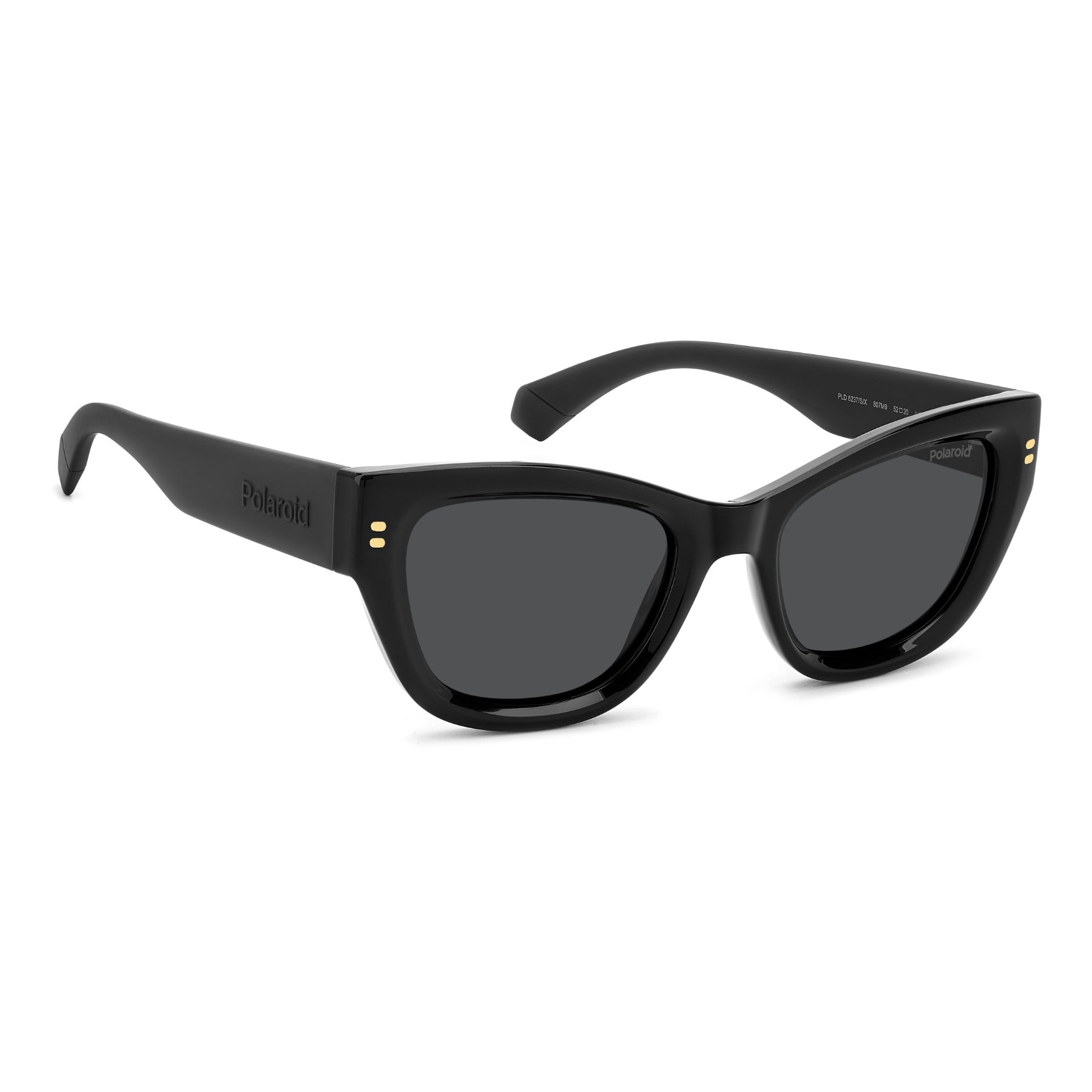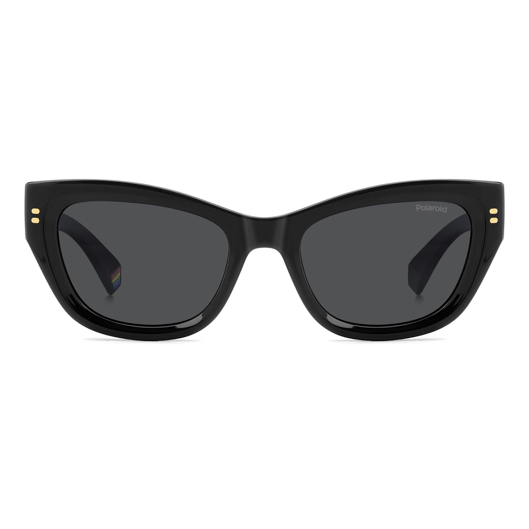 Trendsetters will love these women’s sunglasses from Polaroid, a fresh interpretation of the cat-eye shape. The bold front is multifaceted thanks to bevelling around the lenses, with a sculptural yet structured design. What’s more, the frames can be fitted with prescription sun lenses. The printed rivets are an added accent. The temples are equally striking: they’re maxi in their proportions, covered in rubber for a soft touch, and trimmed by a raised Polaroid logo.