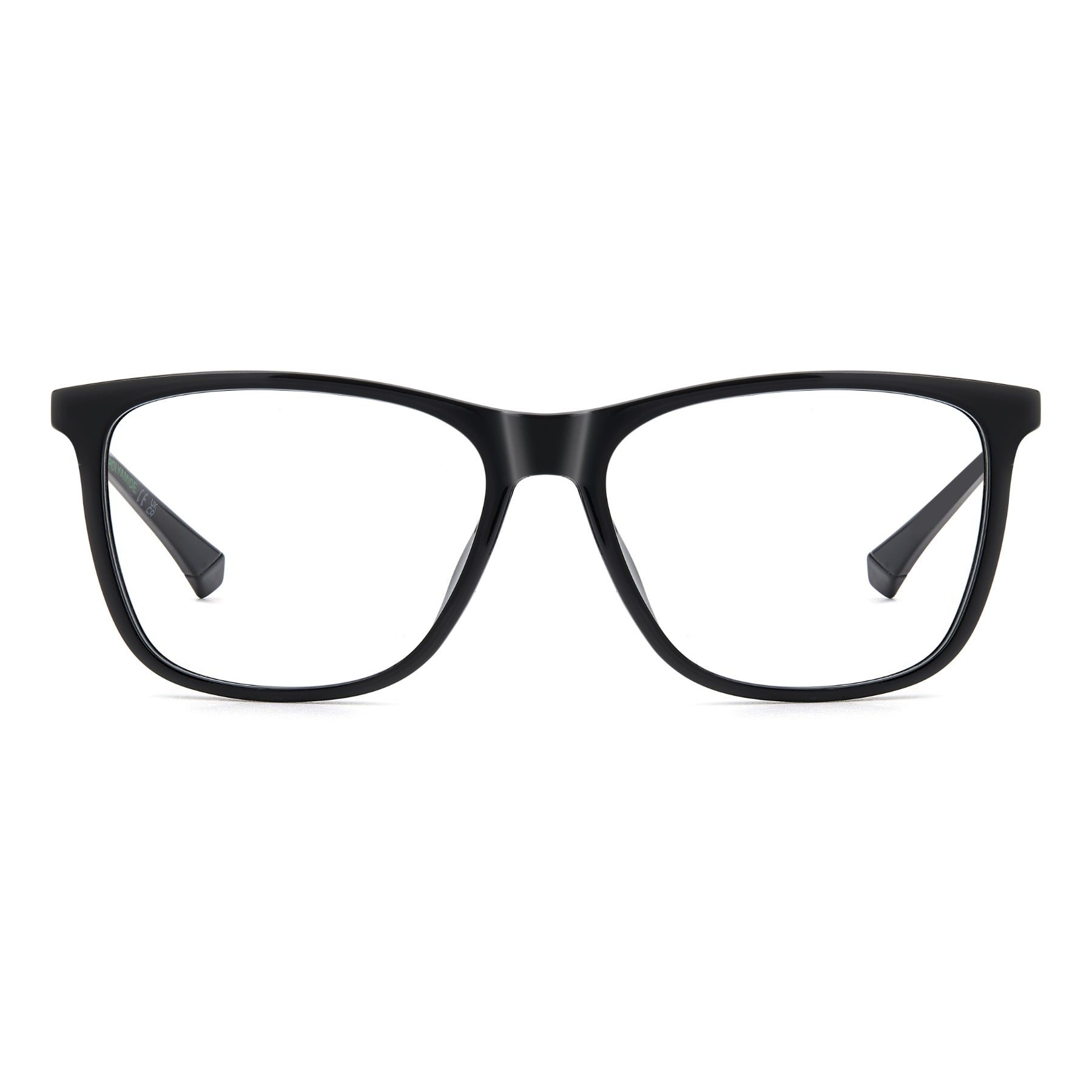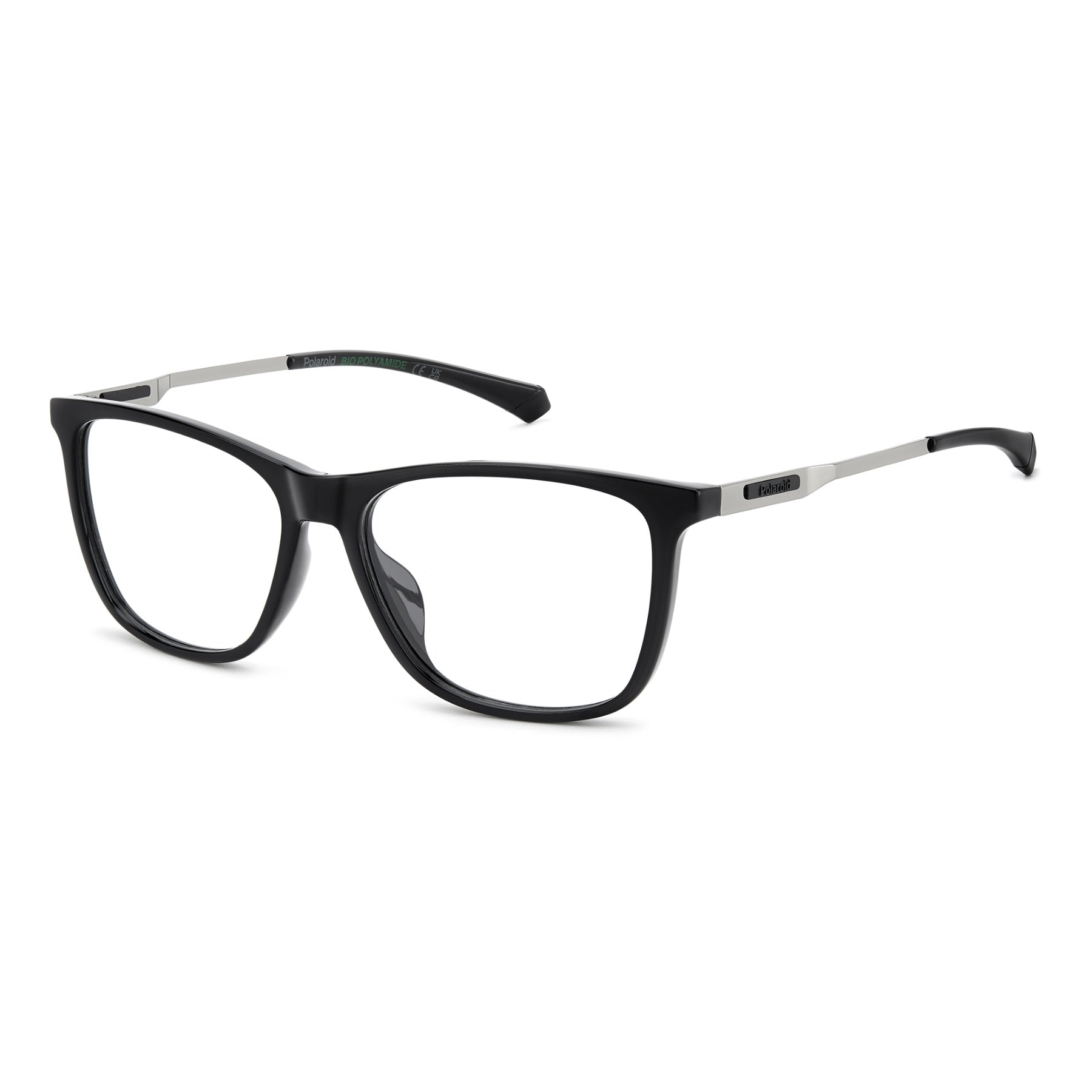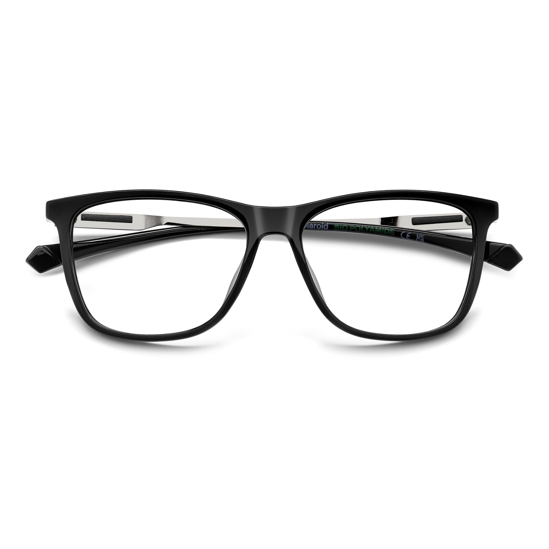 These Polaroid eyeglasses for men embody a contemporary aesthetic. Their high-tech look arises from the recycled metal temples: linear, lightweight and trimmed by a rubber insert with the Polaroid logo. The front is in eco-polyamide obtained from renewable materials, crafted into a rectangular front that will always be in style.