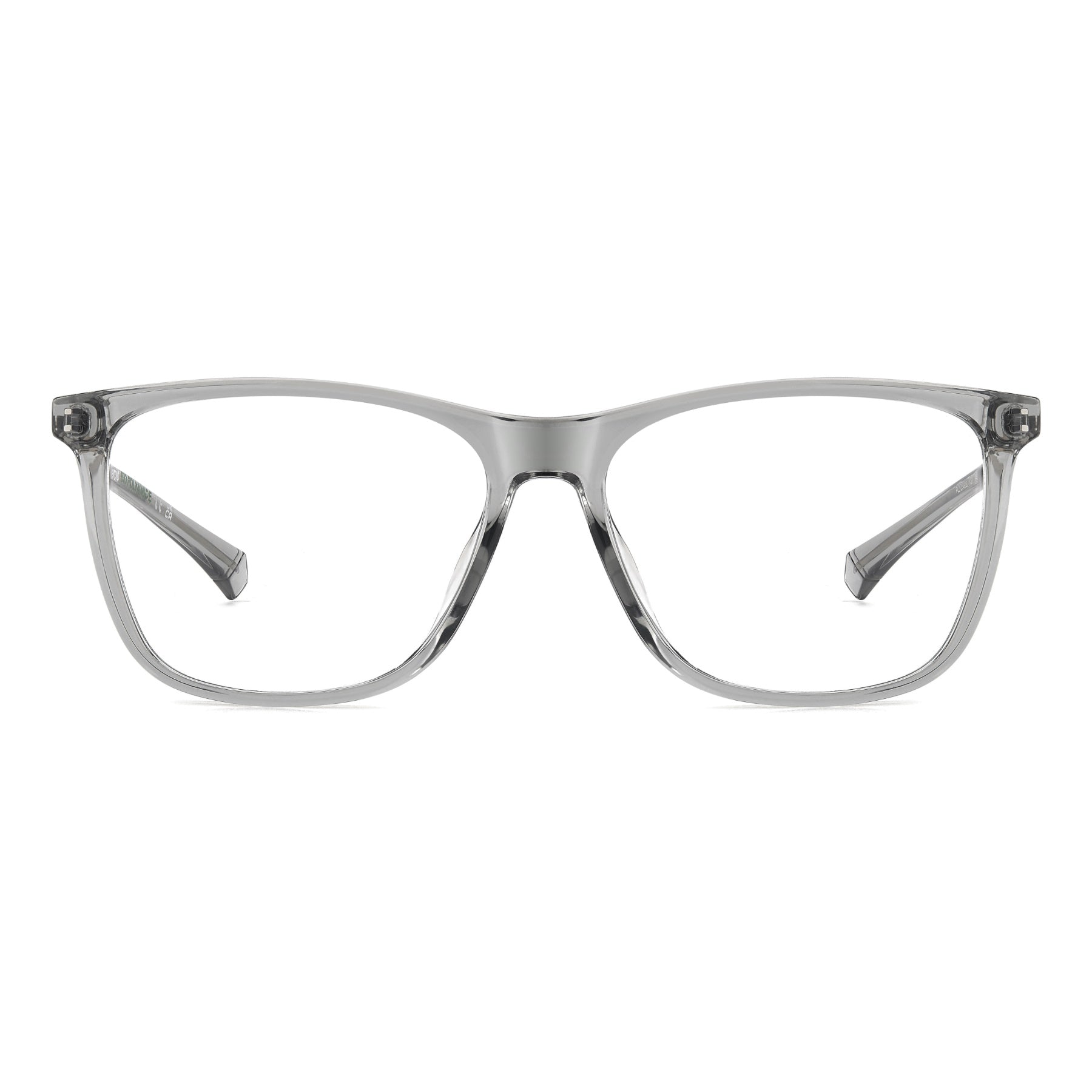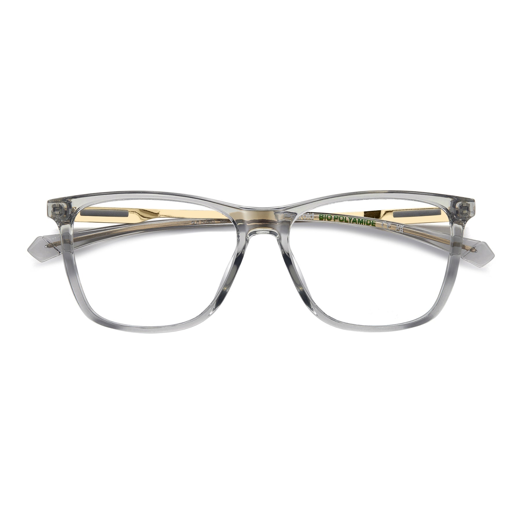 These Polaroid eyeglasses for men embody a contemporary aesthetic. Their high-tech look arises from the recycled metal temples: linear, lightweight and trimmed by a rubber insert with the Polaroid logo. The front is in eco-polyamide obtained from renewable materials, crafted into a rectangular front that will always be in style.