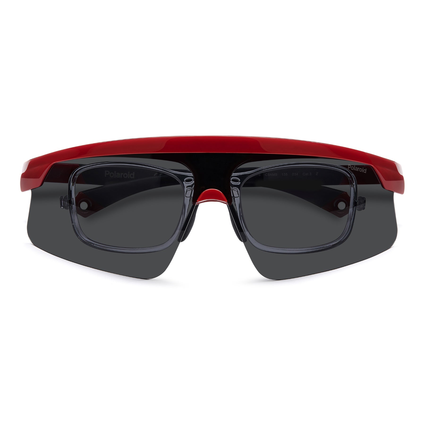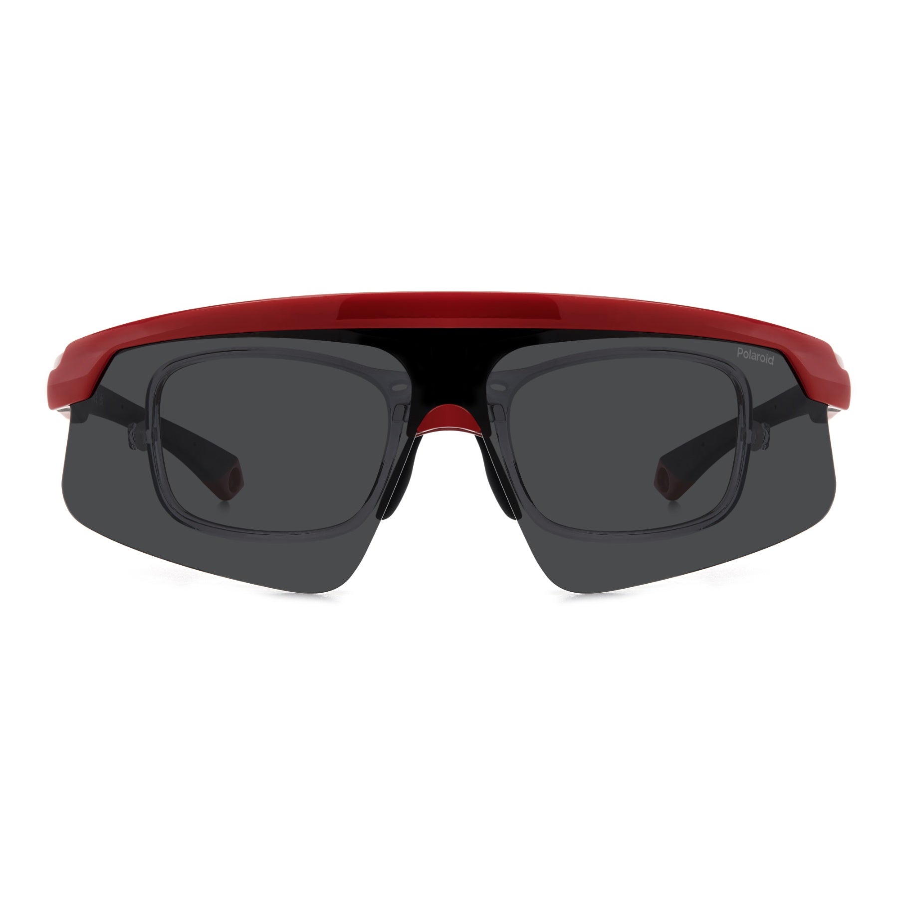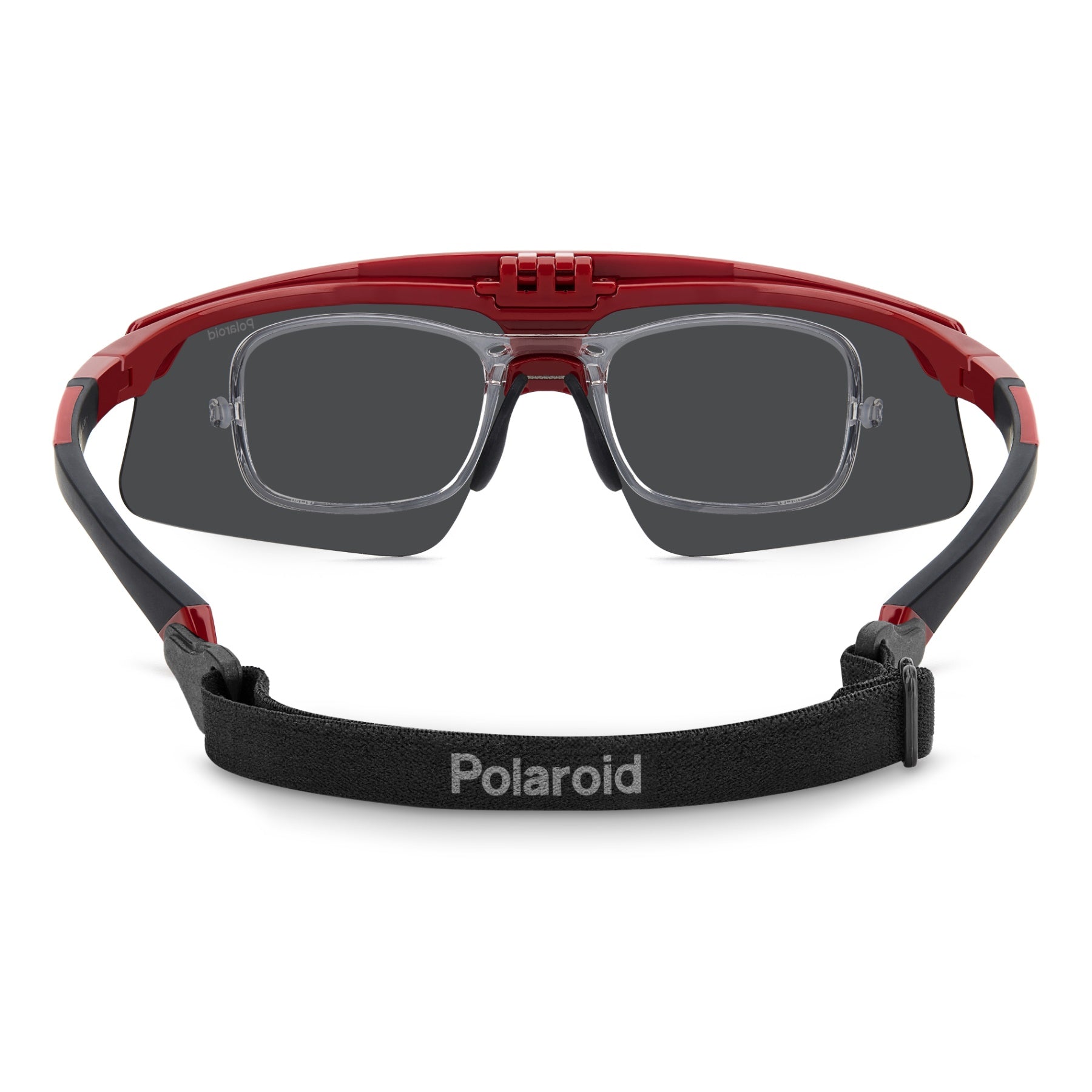 These aerodynamic and high-tech Polaroid sunglasses ride one of the most up-to-date trends in sportswear today. They're composed of a full-coverage frame which rests on rubberised nose pads and end tips for reliable grip. The sun lenses can be raised with a simple movement, revealing the optical lenses below. These glasses can be completed by an elastic strap, purchased separately, which conveniently fits into the openings on the end tips.