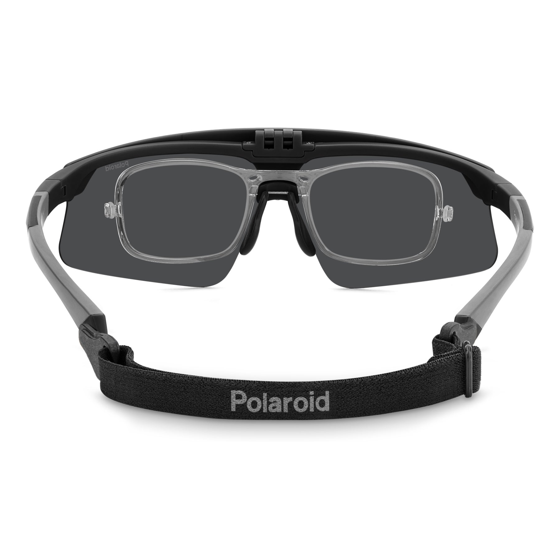 These aerodynamic and high-tech Polaroid sunglasses ride one of the most up-to-date trends in sportswear today. They're composed of a full-coverage frame which rests on rubberised nose pads and end tips for reliable grip. The sun lenses can be raised with a simple movement, revealing the optical lenses below. These glasses can be completed by an elastic strap, purchased separately, which conveniently fits into the openings on the end tips.