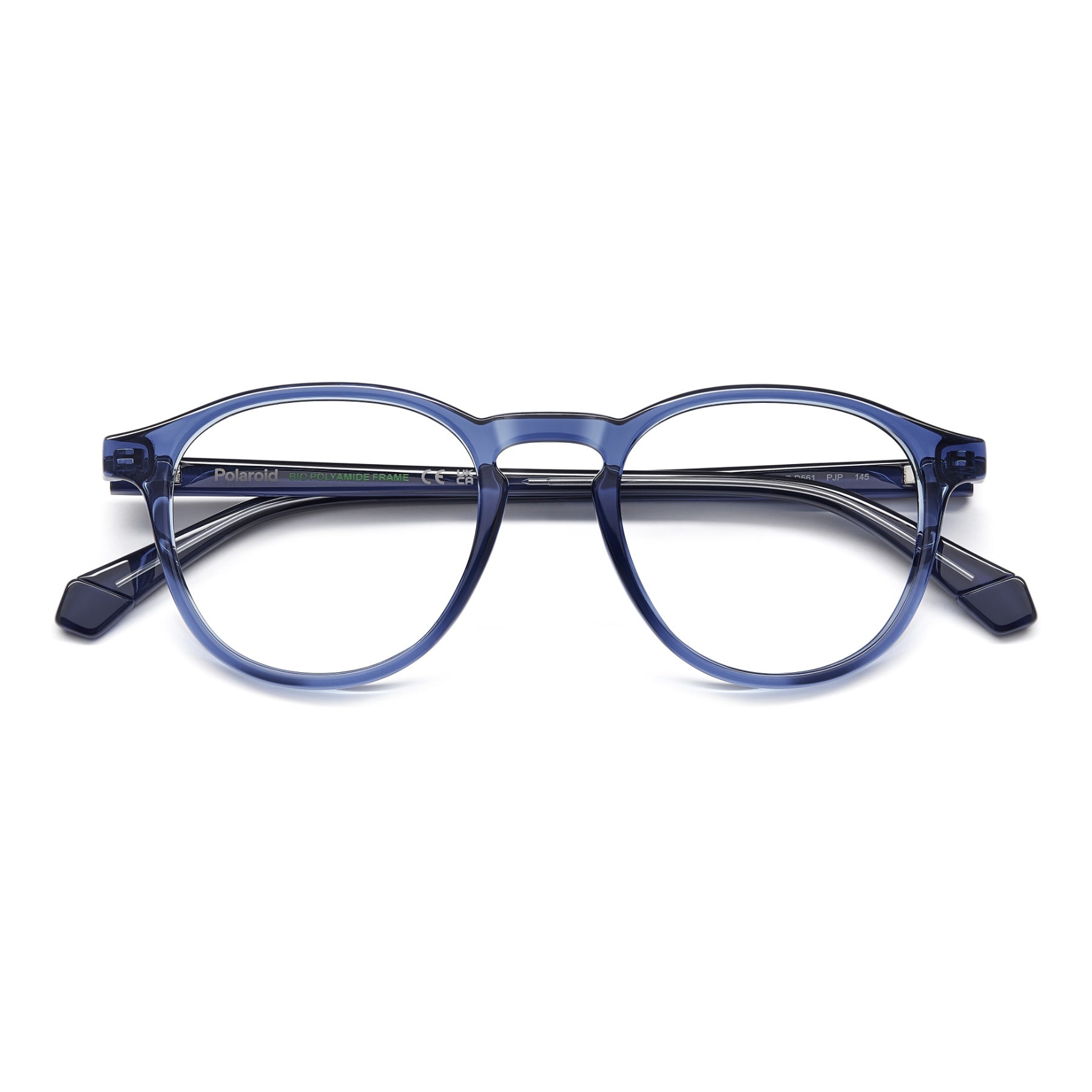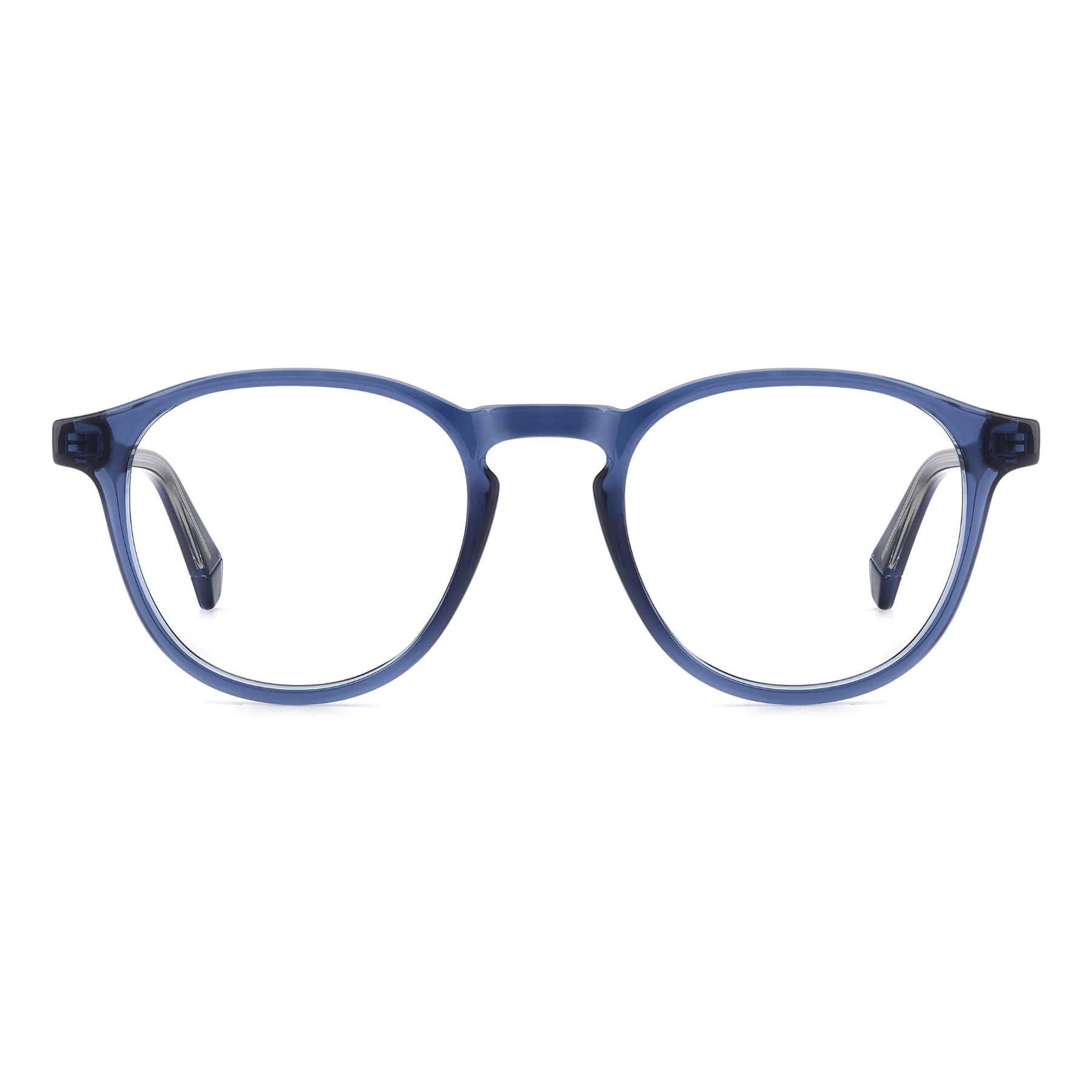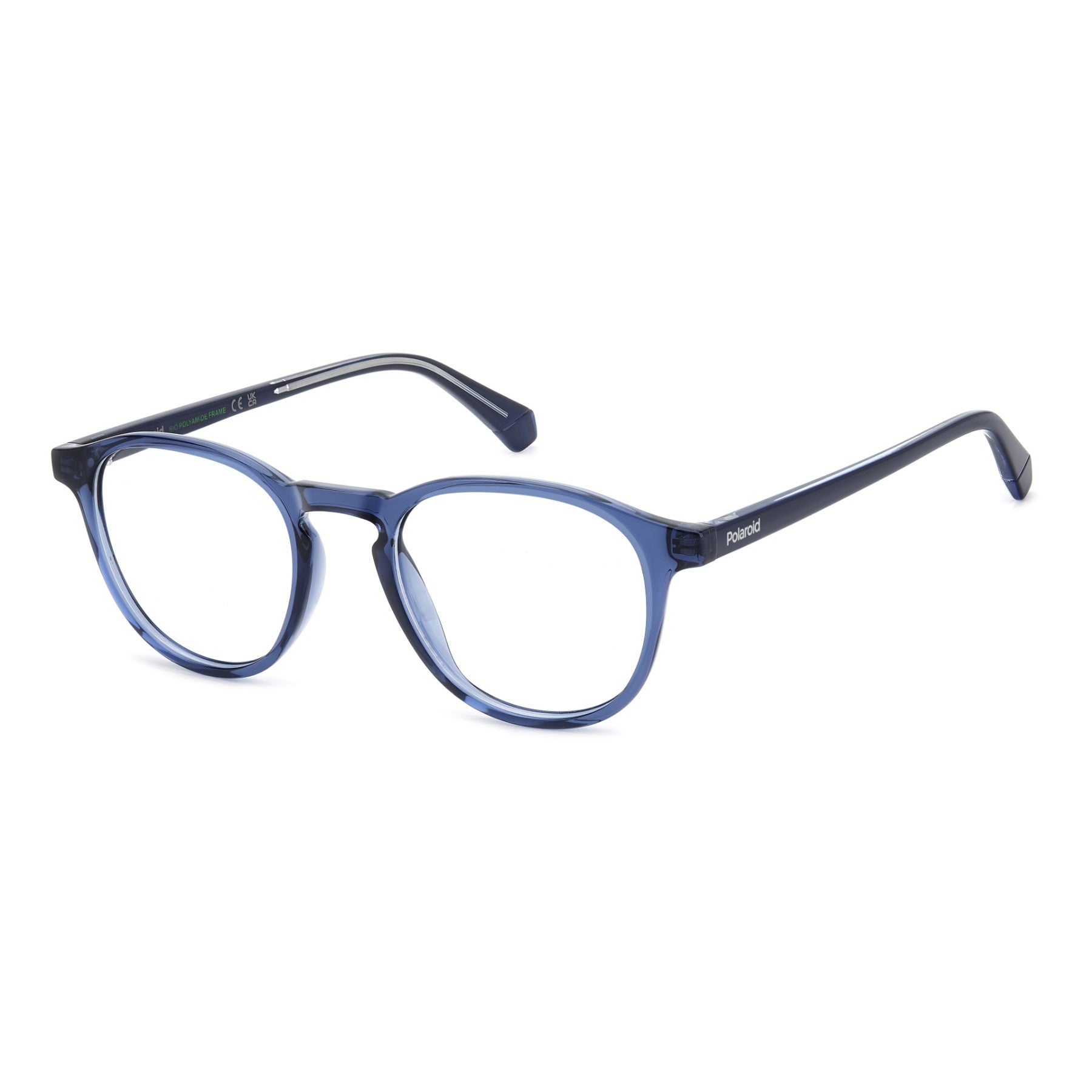 These Polaroid men's eyeglasses are to choose now and wear always. Indeed, they’re a perfect example of practicality: with a slender eco-polyamide structure, they stand up to everyday use while remaining light weight. From their pantos shape with a keyhole bridge up to their harmonious lines, everything comes together for a timeless look. Polaroid makes its move and gives them playfully juxtaposed transparencies. The result is convincing and anything but boring.