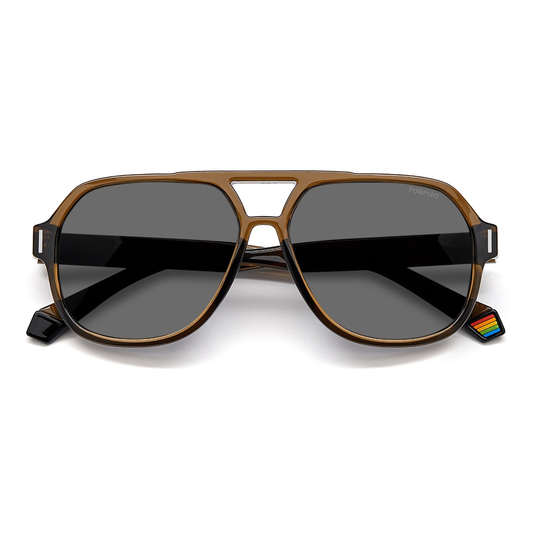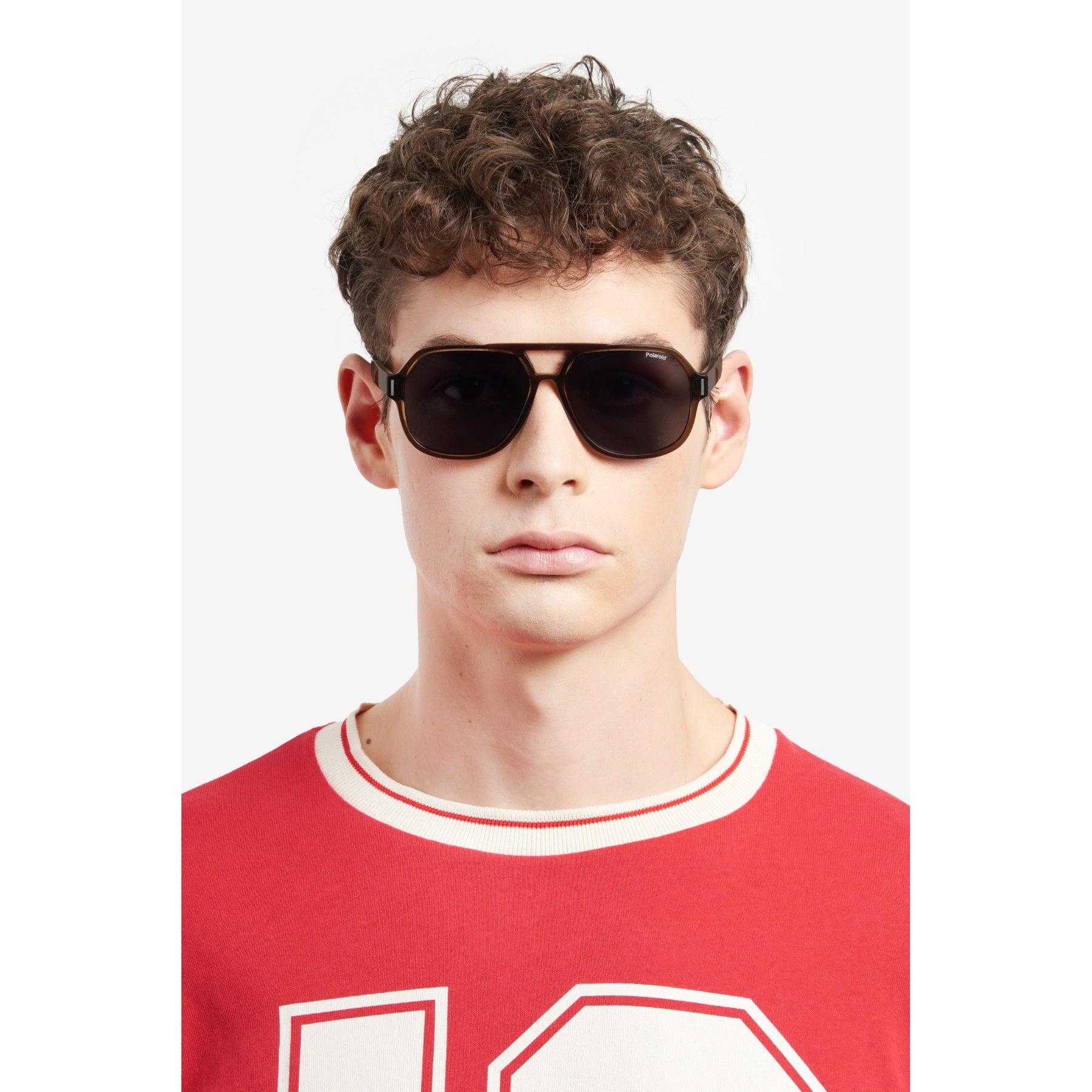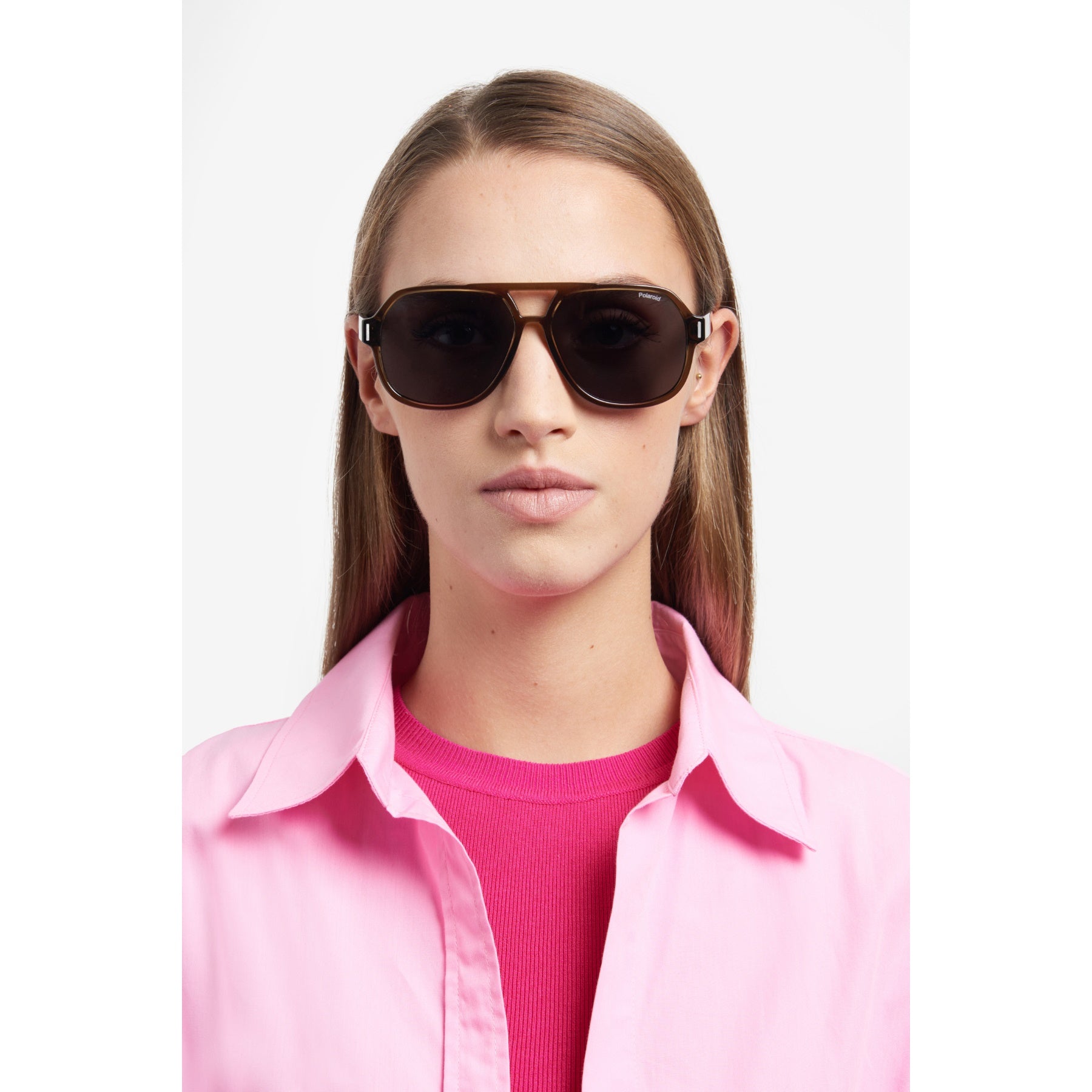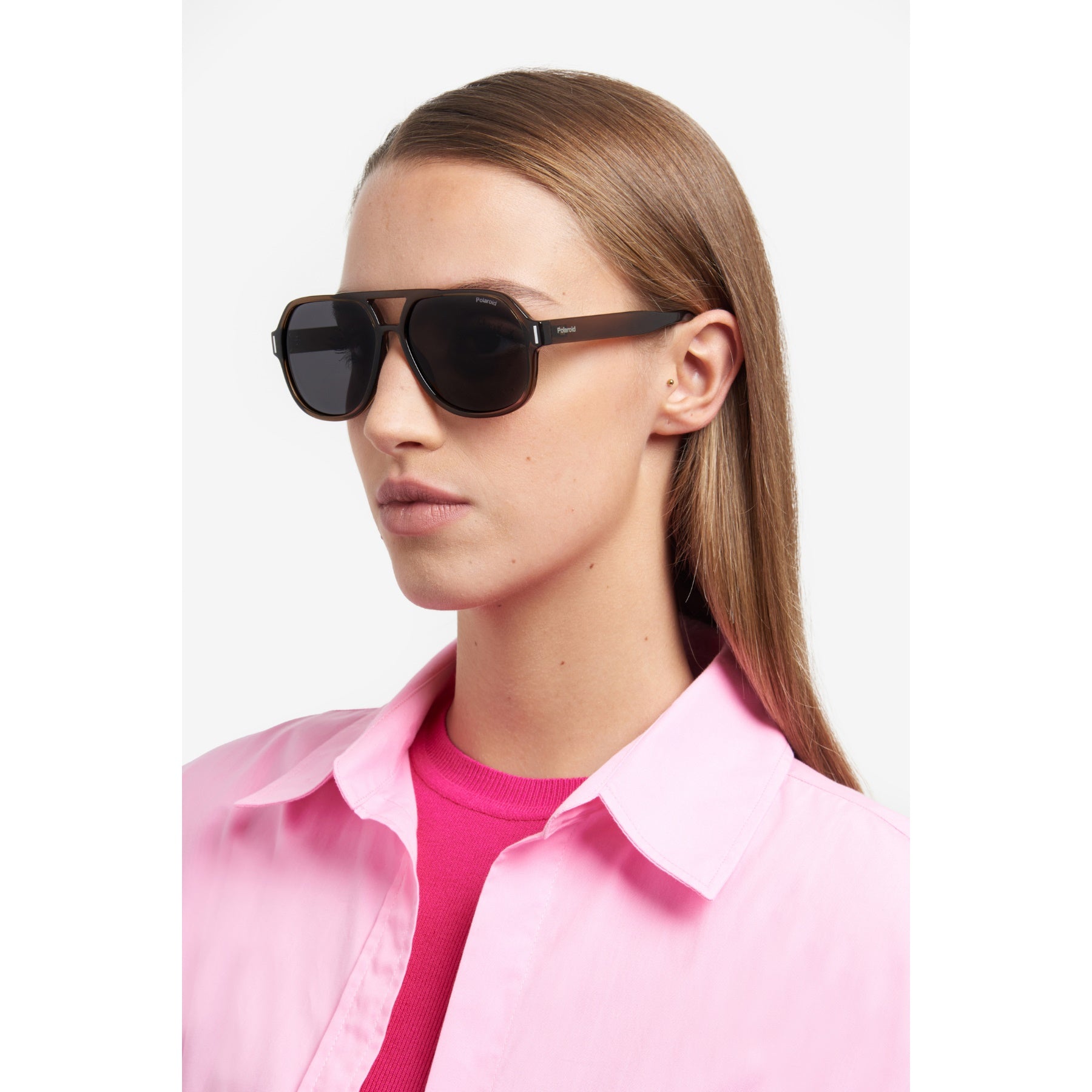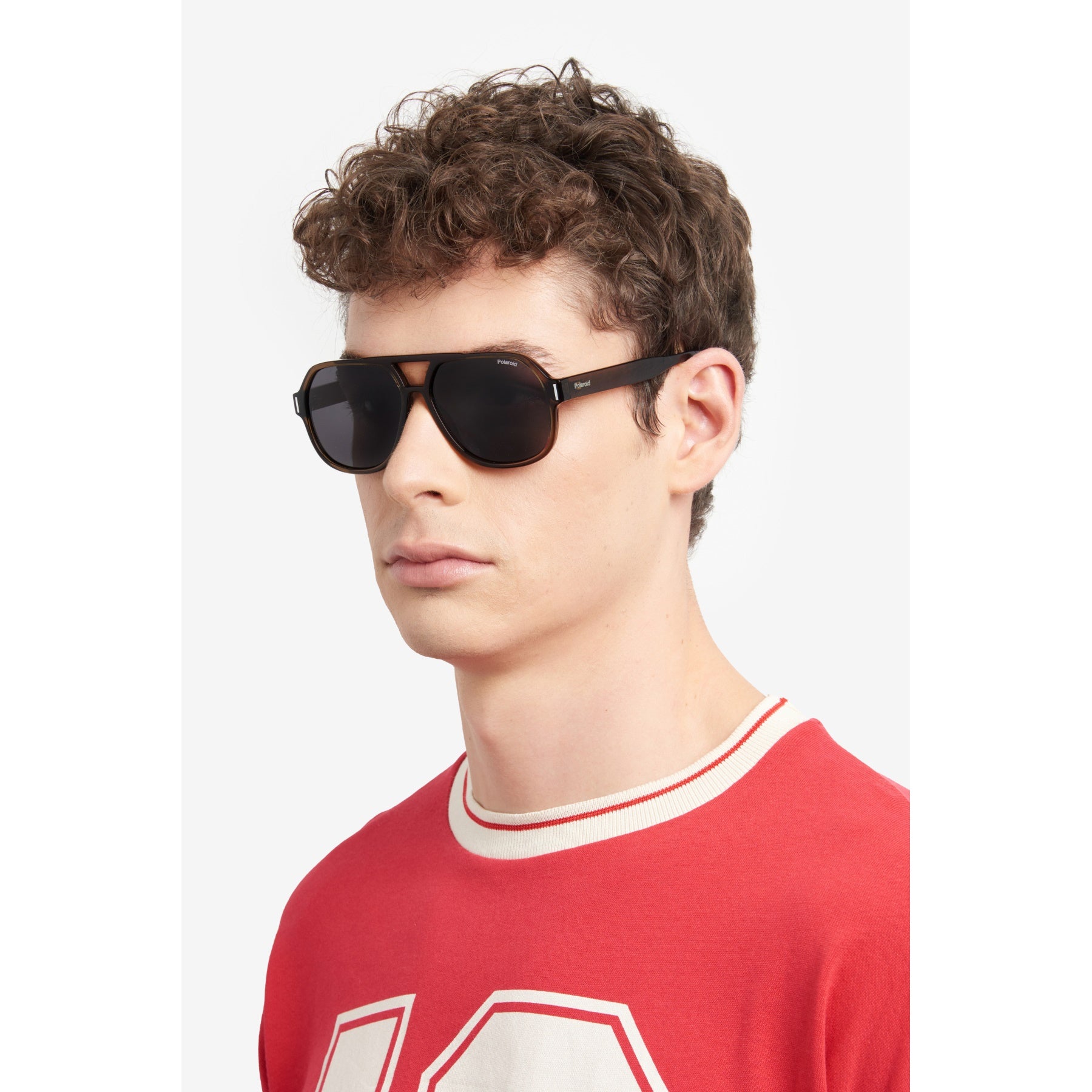 These Polaroid sunglasses stand out for the slim geometric shape of their double-bridge front. The polycarbonate temples of this unisex style feature the Polaroid logo and taper towards the tips, a design that's distinctly Polaroid.