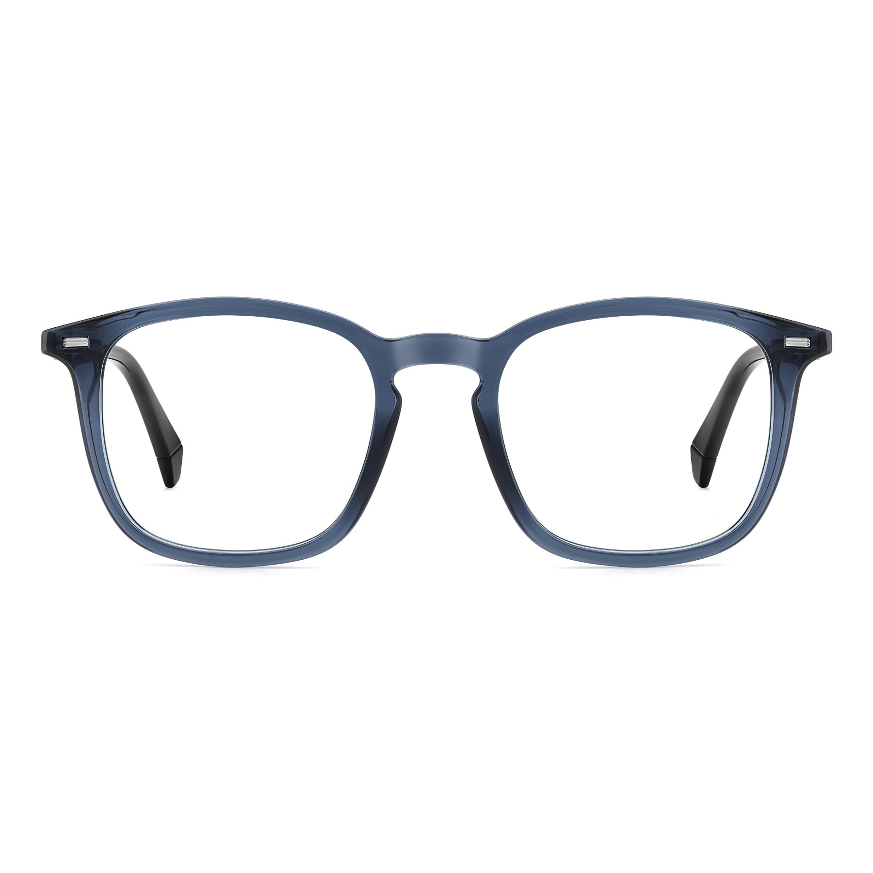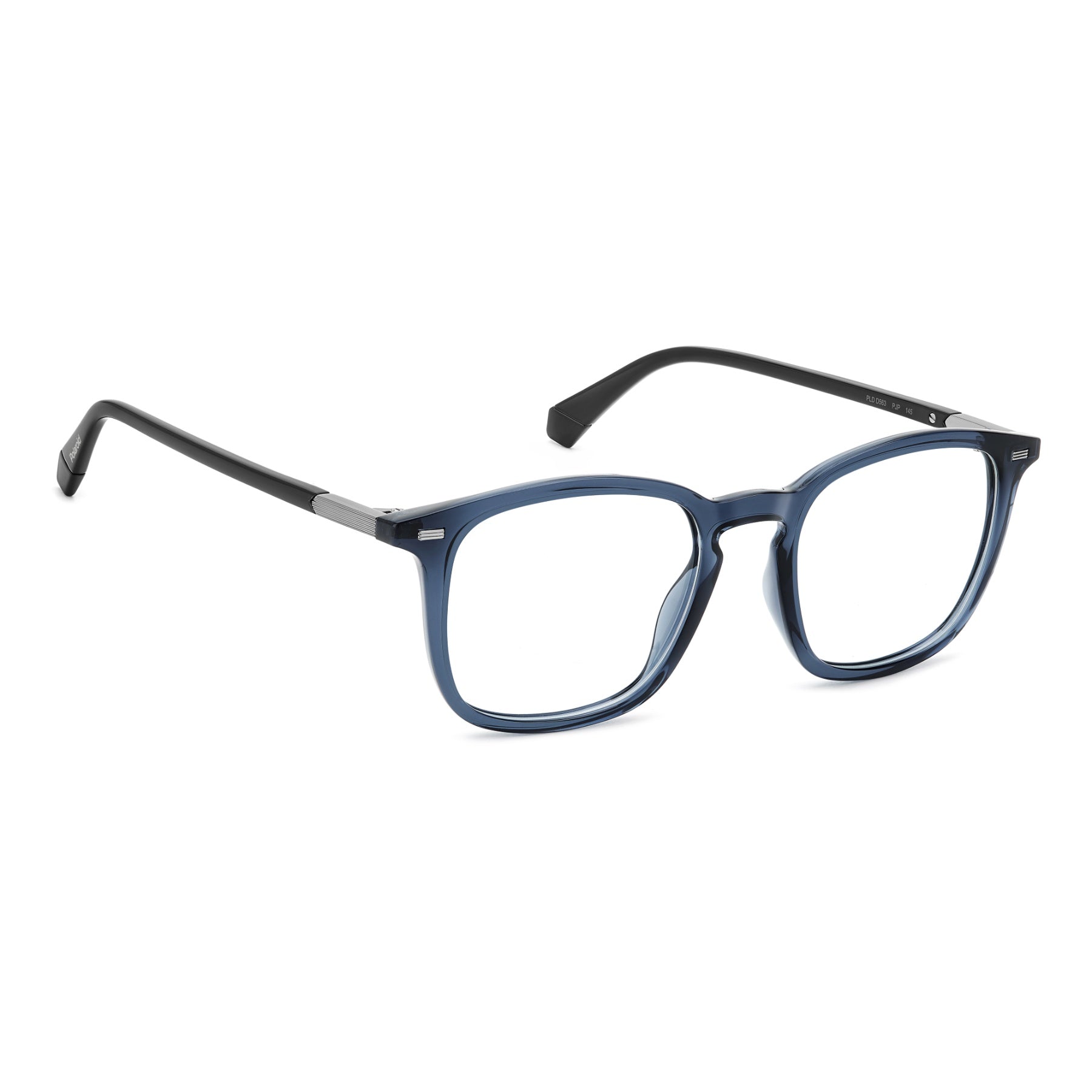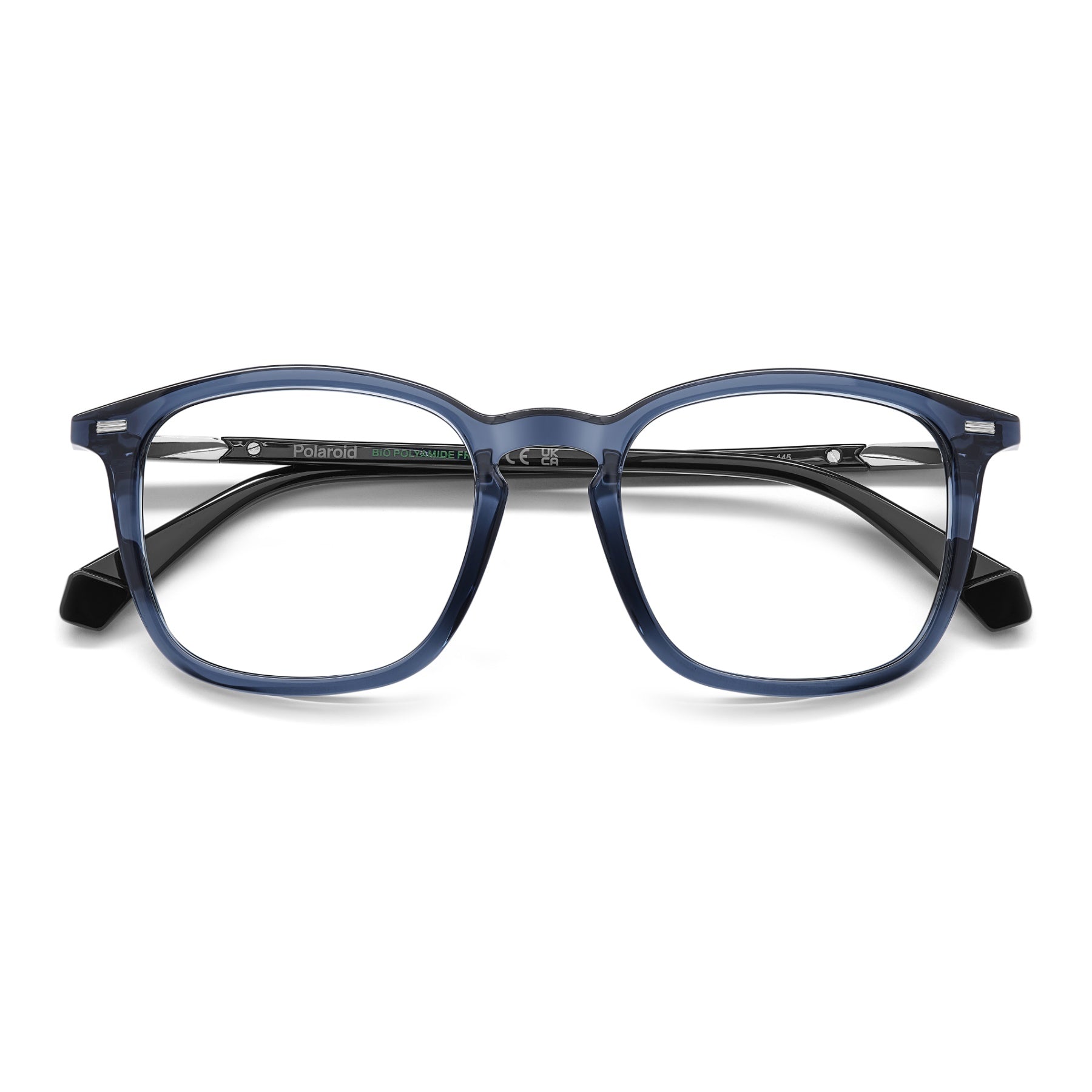 These men's glasses by Polaroid are a deliberate and responsible choice. Their design is a best-seller, updated and made from bio-based materials. The front has a square shape with softened corners and a keyhole bridge: practically a classic to invest in. The metal rivets elevate its style, as does the chiselled metal insert on the temples near the hinge. They come in neutral tones or with transparencies for a fresh touch.
