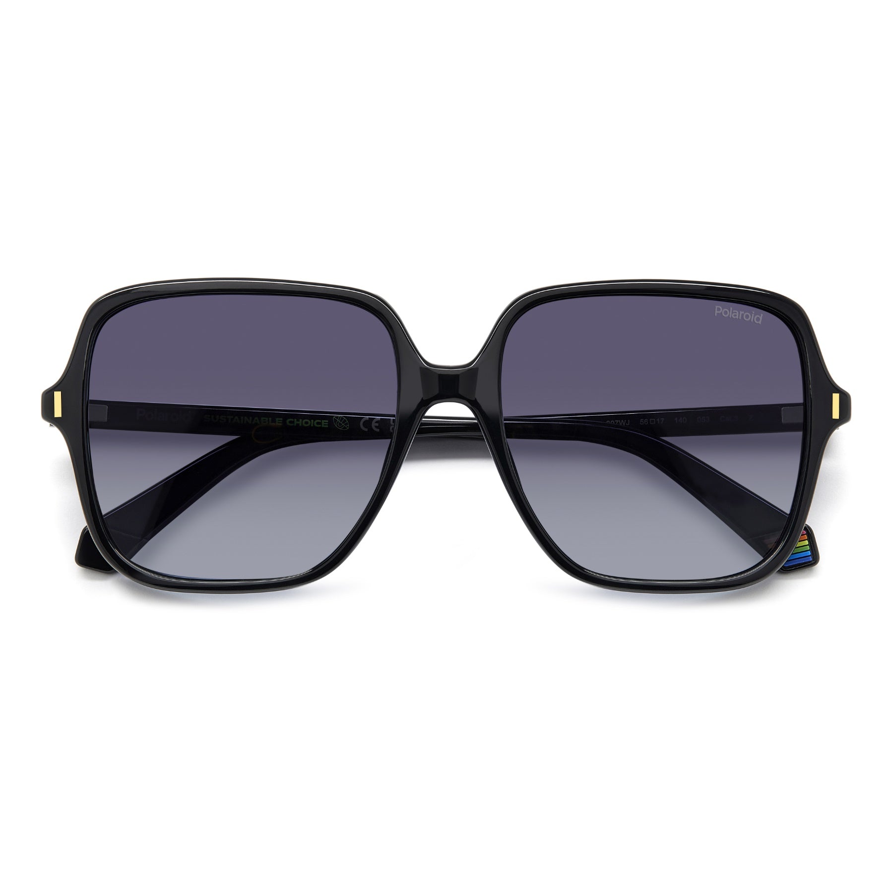 Polaroid has rediscovered the delight that comes from square sunglasses, to be worn in any season. They're invaluable thanks to the versatile silhouette, a delight to wear due to its slender proportions. The 3D printed detail on the front is an exquisite accent. The logo on the temples and the rainbow inserts on the inside of the end tips complete the look. Enough with inaction: the eco-polycarbonate structure attests to Polaroid’s green commitment.